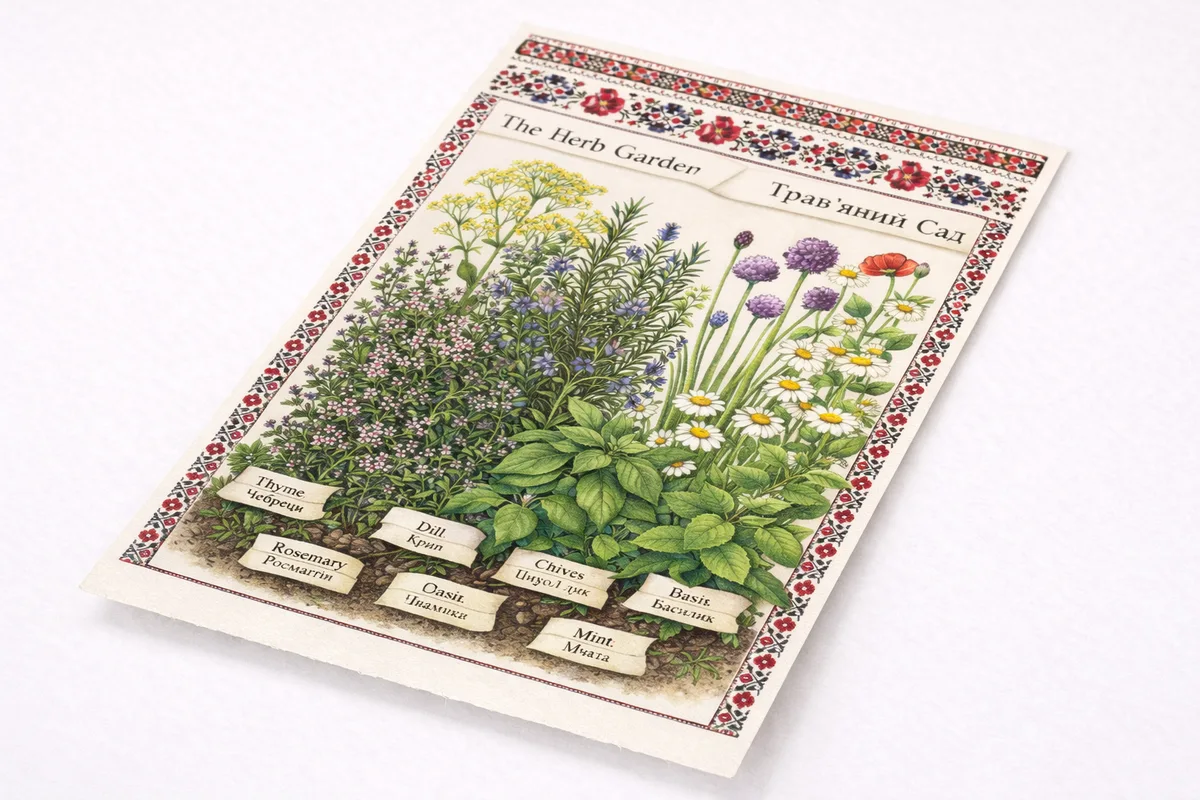 Gouache painting on paper depicting an overflowing herb garden rendered in the style of a botanical field guide. Each plant is labeled in both English and Ukrainian. The painting borders are decorated with traditional vyshyvanka embroidery patterns.