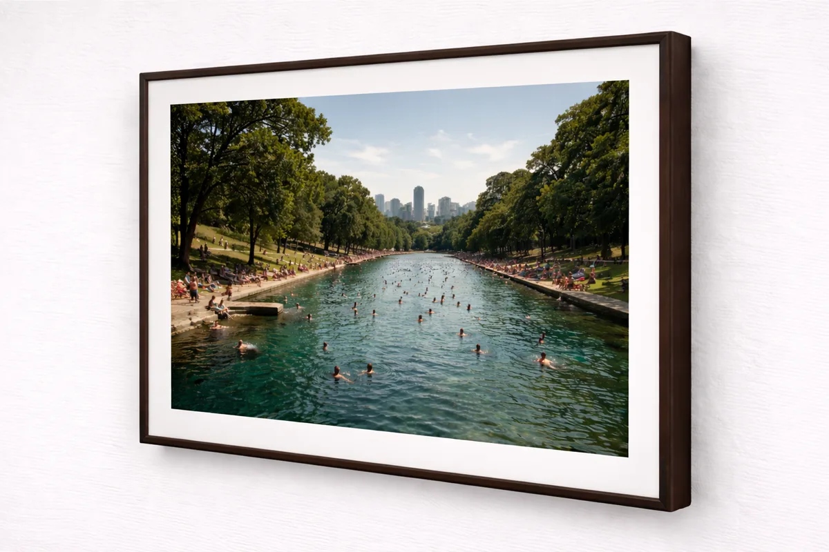 Color photograph of swimmers at Barton Springs Pool on a hot August afternoon. Shot on medium-format film with saturated color and a wide perspective that captures the full sweep of the spring-fed pool against the Austin skyline.
