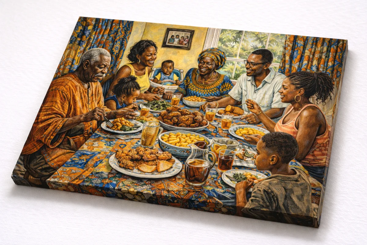 Acrylic portrait of a multigenerational family gathered around a Sunday dinner table. Rich, saturated colors and patterned textiles frame the figures. The composition draws from the artist's memories of family gatherings in Lagos and Atlanta.