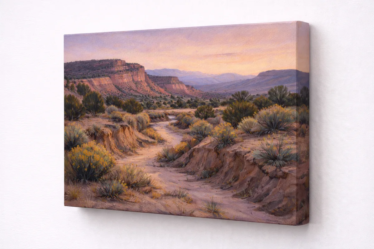 Oil on canvas painting depicting the dry washes near Abiquiu at twilight. Built up in thin glazes of earth-toned pigment over a warm ground, the surface captures the fleeting violet light of a high-desert evening. Unframed on stretched canvas with painted edges.