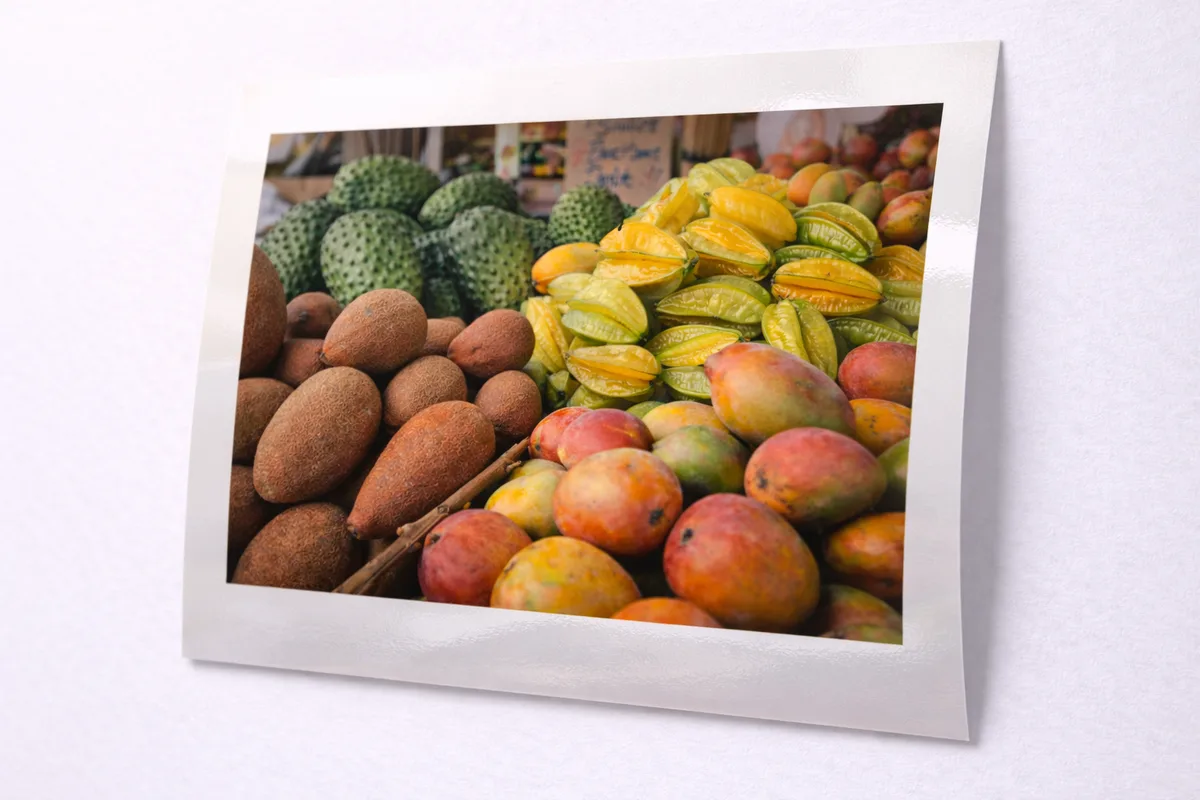 Close-up color photograph of a roadside fruit stand in Homestead, piled with tropical fruit — mamey, guanabana, starfruit, and mangoes. The colors and textures create an almost painterly composition. C-print on glossy paper.