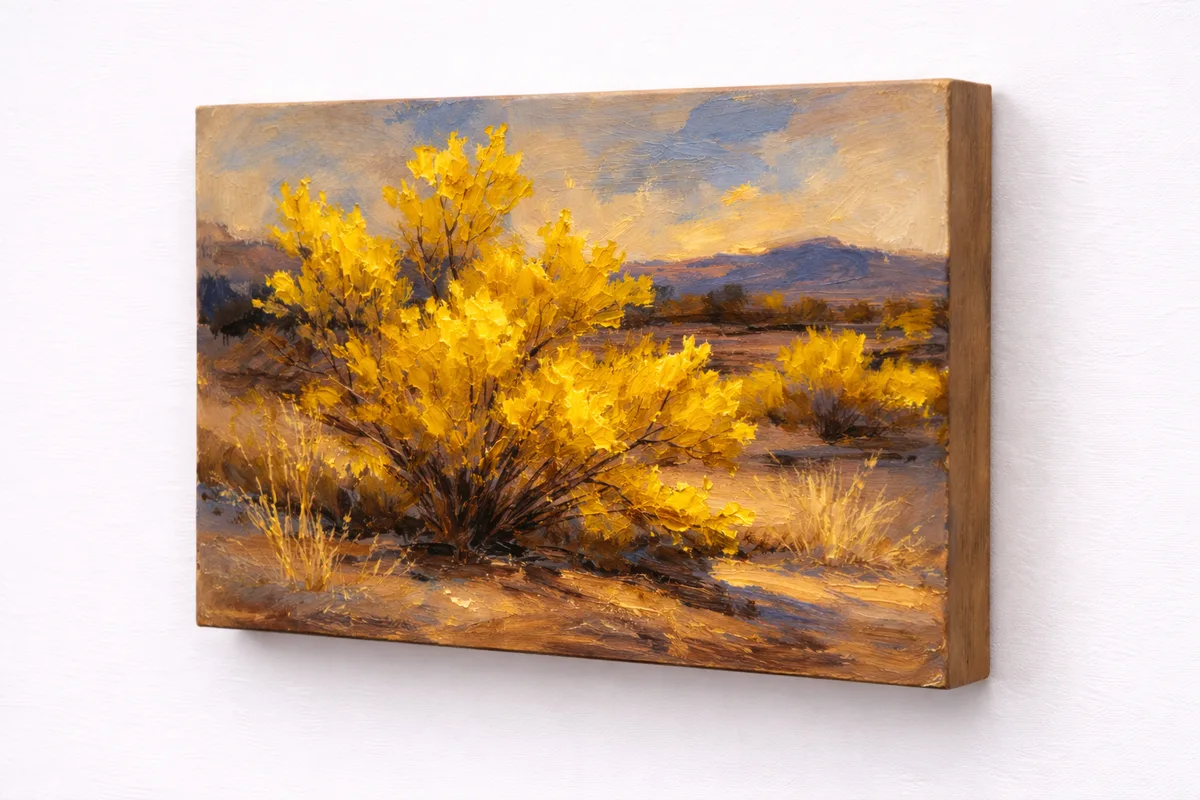 A study of the bright yellow chamisa bushes that bloom along the Rio Grande corridor in autumn. Painted with a limited palette of cadmium yellow, raw umber, and ultramarine. Oil on panel.