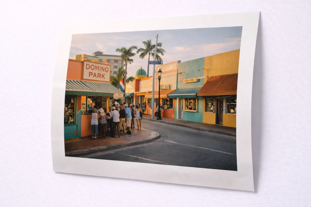 Color photograph of the Calle Ocho streetscape shot on medium-format Portra film. The late afternoon light catches the painted facades of domino parks and ventanitas, creating a warm, nostalgic palette of coral, turquoise, and gold.